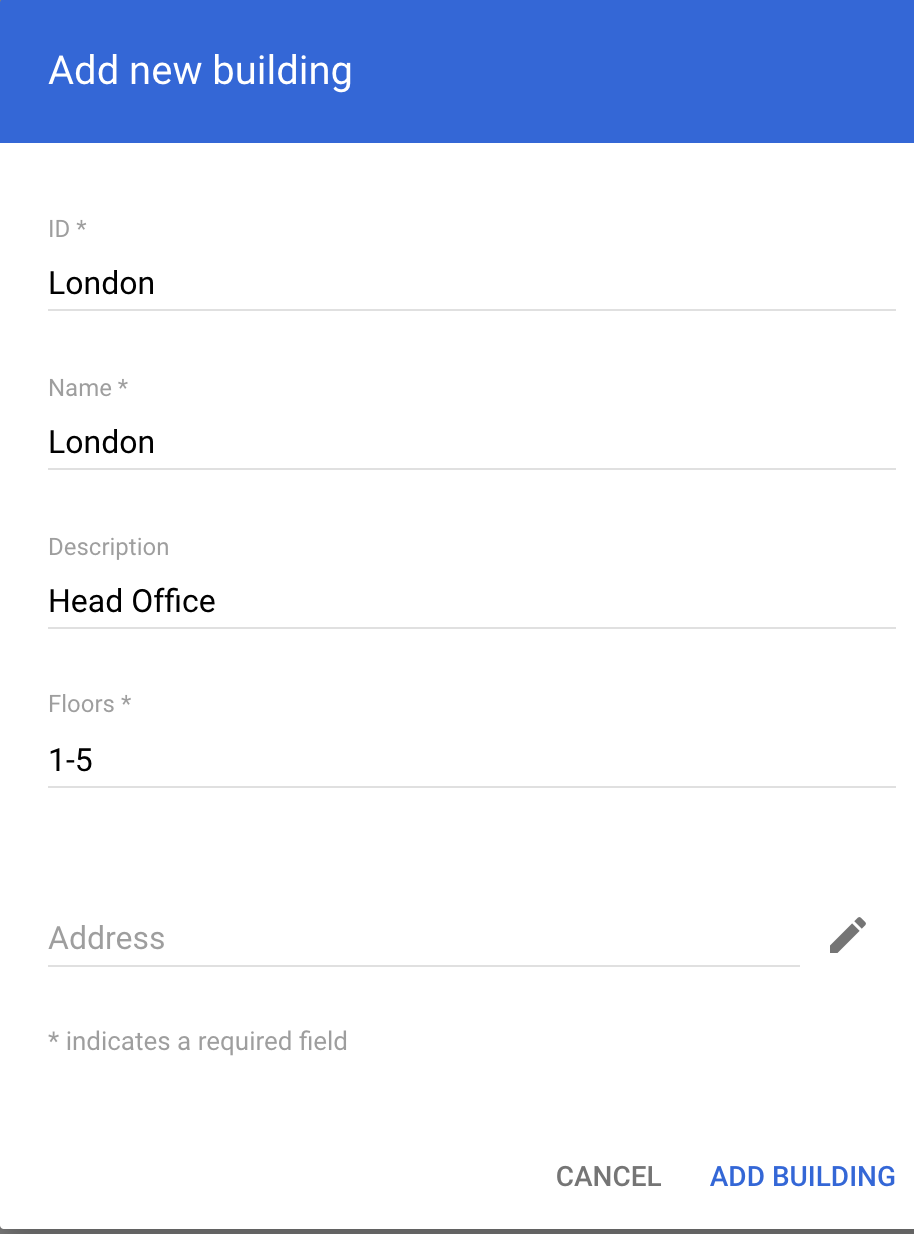 Once you have a building created you can add a Meeting room (see second screen shot)