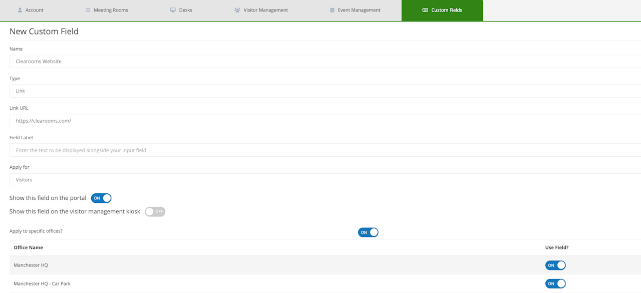 The Custom URL field allows you to add a web link in Clearooms on the Visitors or Meeting Room page, making it easy to access relevant external content directly from the system.