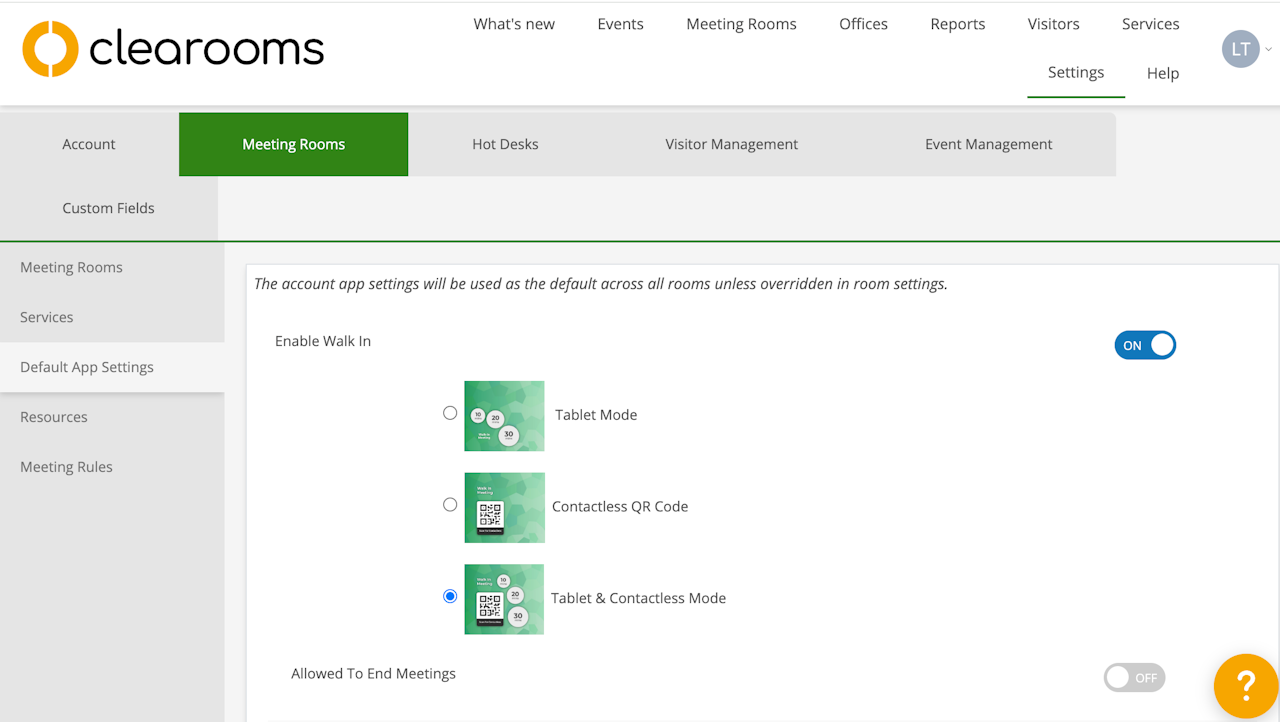 Sliding this button to on to enable walk in mode this allows a user to book a room directly from the tablet display app.