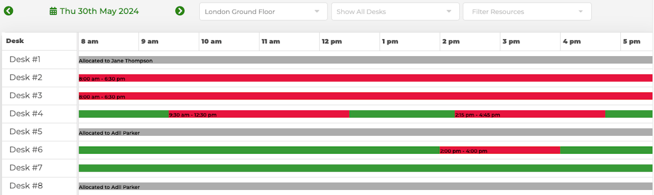 When enabled you will be able to view desk availability in a list view by selecting the desk list view option on the offices page (default screen) Available desks will show in green, booked in red and grey if unavailable.