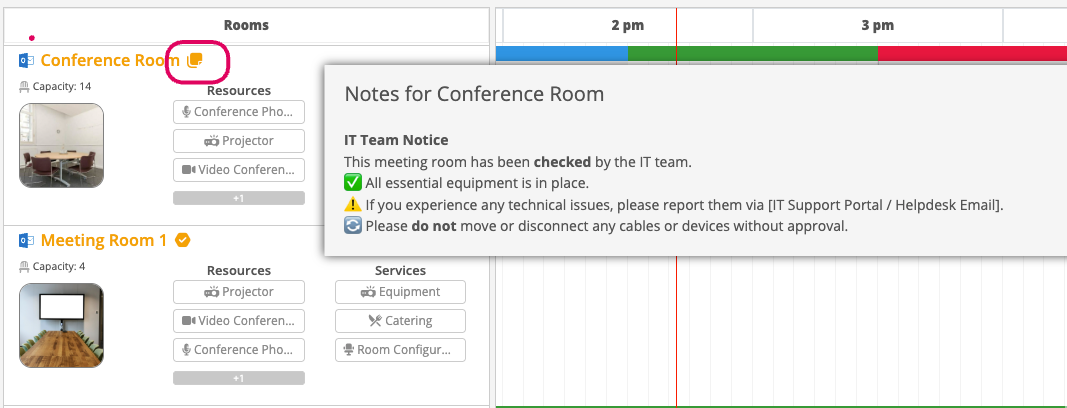 When users click on the Meeting Rooms tab they will notice a notes icon next to any meeting rooms with notes added. If you hover over the icon a message will say "This room has notes" Click the icon to reveal the note.