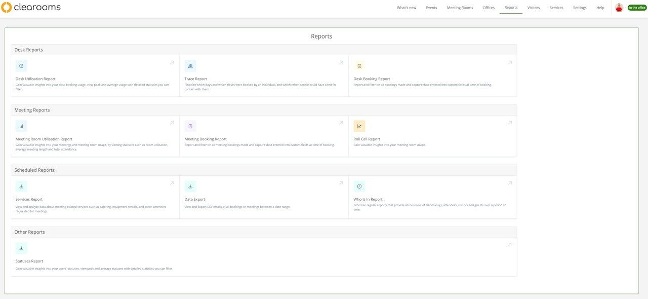 This section provides an overview of all available reports designed to help you monitor workspace usage, track bookings, and enhance visibility across your offices. Whether you're analysing desk usage, monitoring meeting attendance, or identifying who's in the office, these reports offer detailed insights with exportable data for further analysis.
